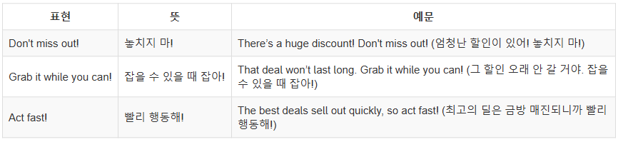 | Grab it while you can! | 잡을 수 있을 때 잡아! | 기회가 있을 때 적극적으로 행동하라고 조언할 때 |